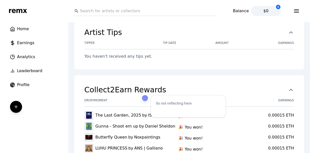 i tried tipping the drop “ascend beyond” but due to my wallet issues, i was unable to but the drop is still showing collected on the drop page and on my profile, but its not reflecting in my earnings page.
