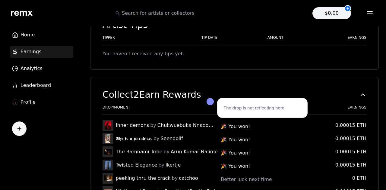 i tried tipping the drop “Show me the way” but due to my wallet issues, i was unable to but the drop is still showing collected on the drop page and on my profile, but its not reflecting in my earnings page.