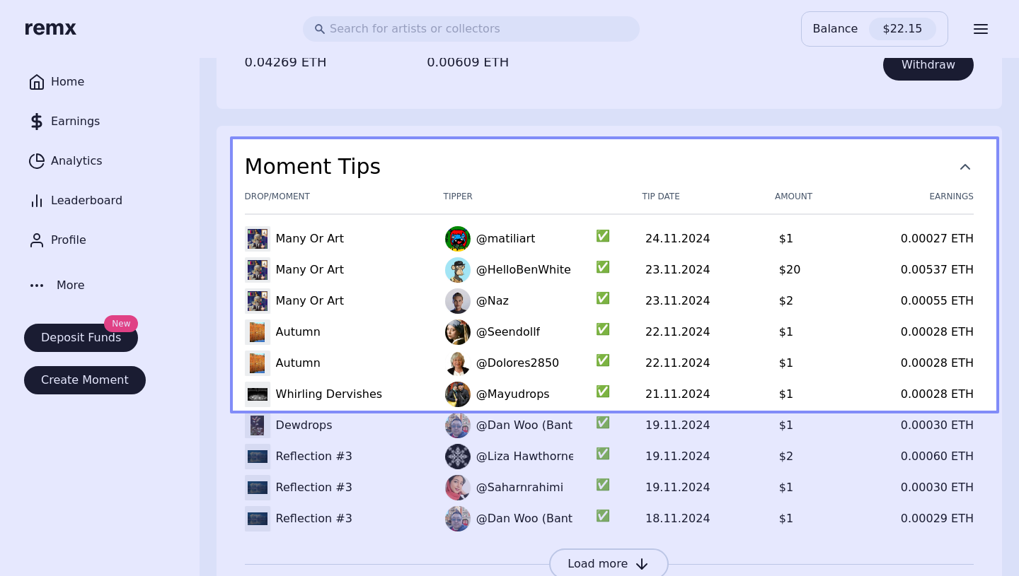 Hello, sorry to bother you but I think there is a mistake in my earnings section. I received $26 (0.00703 ETH) in tips after transferring it to my wallet on 11/21/2024. I also received Collect2Earn Rewards twice (0.00015 ETH x 2) But now I see that there is only $22.15 (0.00609 ETH) in my earnings section. Can you check?