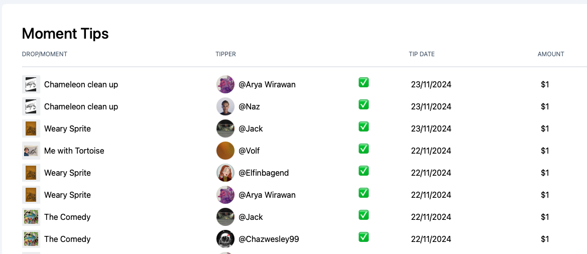 Not sure what’s happening but on one of my recent moments it shows $5 in Tips but in my earnings I only have 1 tipper of $1 for that moment. I see Naz commented that he had C&T’d not sure who else so I cant thank them for the Tip. Also it would be nice to be able to send a personalised message with the “thanks for the tip” message. It would also cool to be able to create a drop that an Artist can share only with specific people/accounts who have been supportive of their journey.
